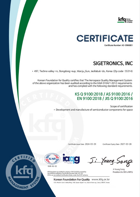 During the development process, the company obtained the KS Q 9100 aerospace quality-management certification, officially verifying its production capabilities for high-reliability space-grade electronic components. The technology was developed based on Sigetronics’ accumulated defense power-semiconductor know-how from mass-producing high-power switching devices (MCTs) for missile fuzes.